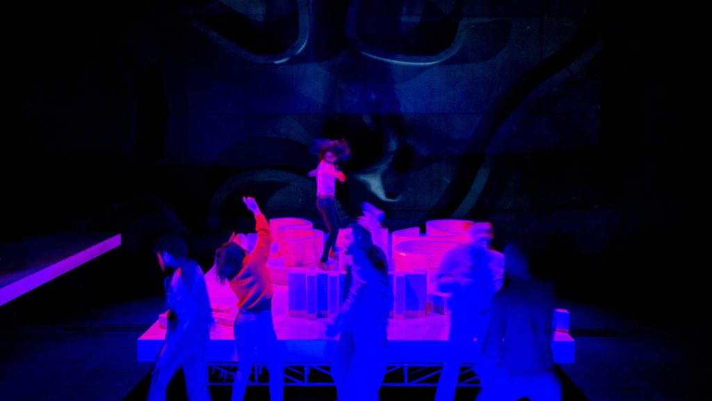 Cette parole Ă©clatĂ©e surgit dans un dĂ©cor dystopique, un Alger fictionnel tel quâil fut fantasmĂ© par Le Corbusier dans les annĂ©es 30. Avec le plan « Obus », lâarchitecte avait imaginĂ© une CitĂ© Radieuse algĂ©roise, avec un immeuble long de 10km dont la toiture serait une autoroute. Cette « superstructure », mĂ©taphore sidĂ©rante de lâaveuglement colonial, devient le dĂ©cor puissant de la dĂ©sespĂ©rance et de lâurgence de vivre de ces jeunesses algĂ©roises.